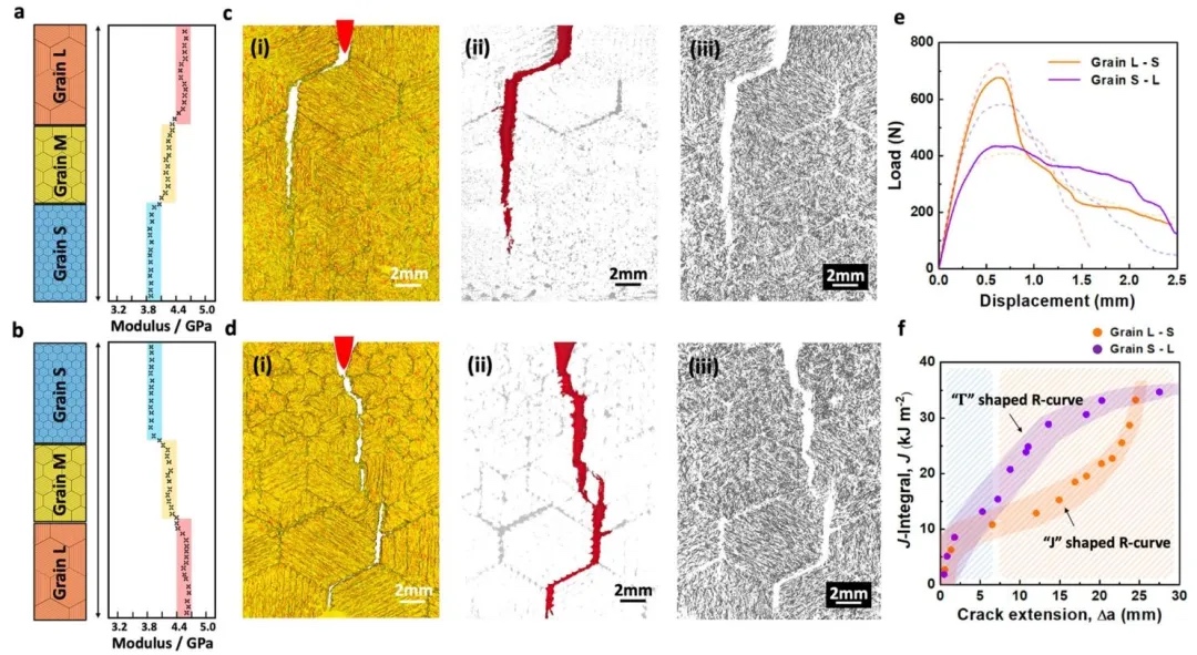 6. 梯度微结构的刚度与韧性协同优化,通过构建粗-细(L→S)和细-粗(S→L)颗粒梯度结构,利用拉伸模量测试和J积分计算,研究了梯度分布对材料综合力学性能的影响。结果表明,L→S梯度结构通过粗颗粒区裂纹偏转、细颗粒区裂纹桥接实现“J型”断裂韧性曲线,而S→L梯度结构呈现“Γ型”曲线,两者均实现了刚度与韧性的协同提升。