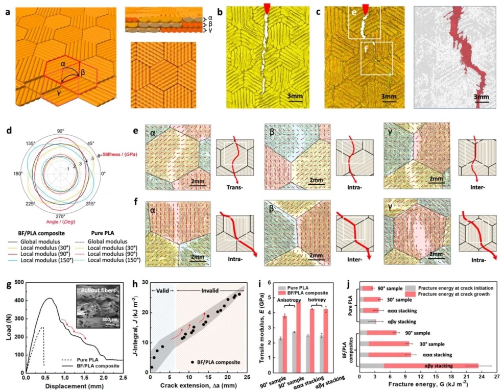 本研究开发了一种受自然启发的3D打印分级复合结构,其通过颗粒状单元的定向纤维束和界面空隙,实现了裂纹路径调控与能量耗散。研究表明,交替堆叠序列(αβγ)可诱导裂纹沿“ arrester方向”扩展,使断裂能较单一堆叠(ααα)提升2.4倍;颗粒尺寸梯度(粗-细或细-粗)可协同提升材料刚度与韧性,其中粗颗粒区促进裂纹偏转,细颗粒区增强裂纹桥接。工艺诱导的界面空隙并非缺陷,而是作为优先裂纹路径引导裂纹分级扩展,结合纤维束的各向异性刚度,形成了类似天然多晶材料的抗裂机制。该结构设计为复合材料的抗裂性与损伤容限优化提供了新思路,有望应用于航空航天、建筑等需要高韧性结构的领域。