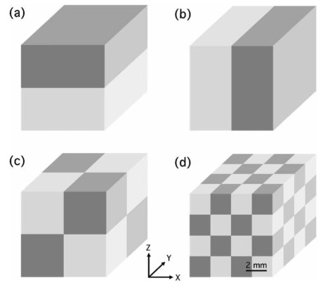 △通过LPBF打印制造的8×8×8 mm³立方体样品。不同的灰色阴影表示不同的扫描参数。