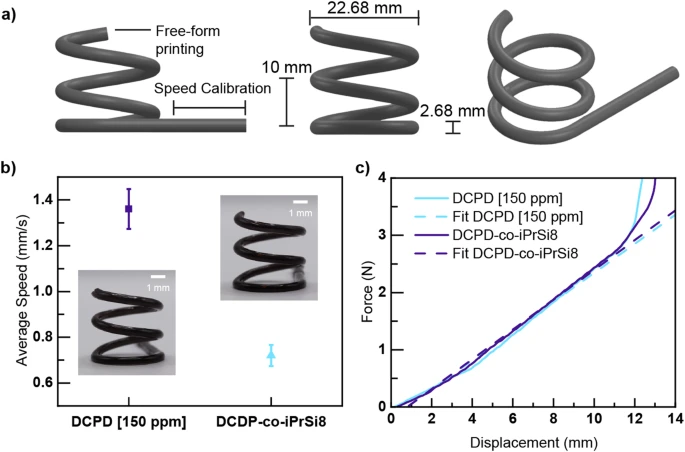 △使用不同的 FP 墨水自动进行自由形式 3D 打印弹簧,尽管前端聚合速率不同,但仍可实现相同的几何形状和弹簧常数。