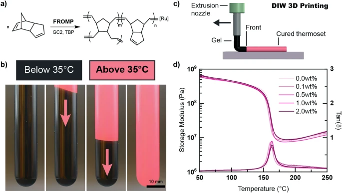 导读:近年来,增材制造彻底改变了材料和设备的制造方式,突破了设计复杂性和材料功能的界限。在众多开发的技术中,直接墨水写入 (DIW) 3D 打印因其在处理从软水凝胶到高性能热固性材料等各种材料方面的多功能性而备受关注。该领域最具挑战性的前沿之一是在打印过程中精确控制聚合过程,特别是对于通过正面聚合机制固化的热固性聚合物。