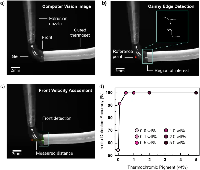 2025年8月19日,由Mejia等人领导的研究人员开发了一种用于热固性聚合物直接墨水写入(DIW)3D打印的实时监控系统。这套系统解决了打印过程中聚合过程的控制难题,特别是对于通过正面聚合机制固化的热固性材料。