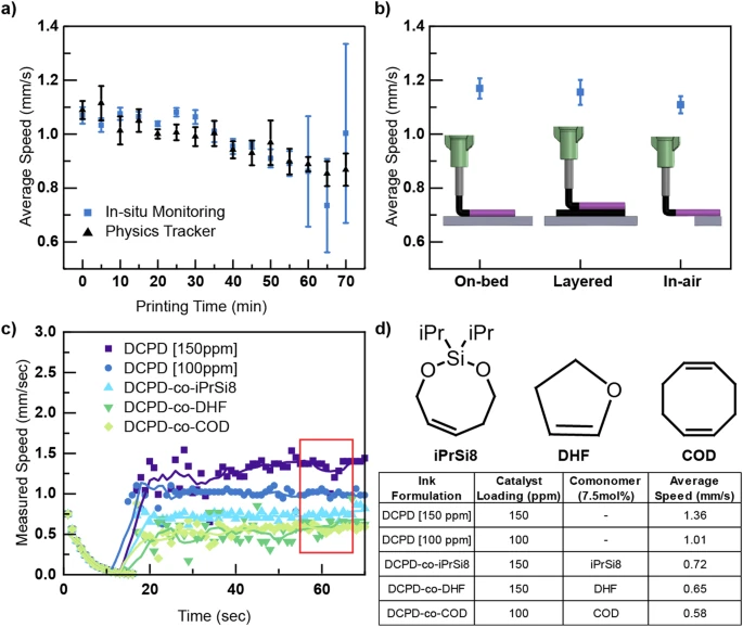 监测系统的可扩展性和模块化设计进一步提升了吸引力。架构采用现成的组件和开源软件框架设计,可以轻松集成到现有的工业3D打印机中,无需高昂的改造成本。研究人员强调,他们的传感器组件和控制算法可以针对其他进行热激活反应的材料系统进行定制,例如硫醇-烯点击化学或环氧基网络,从而拓宽了与直接水(DIW)工艺兼容的适用化学范围。这种适应性使他们的工作成为构建响应式增材制造未来的基础。