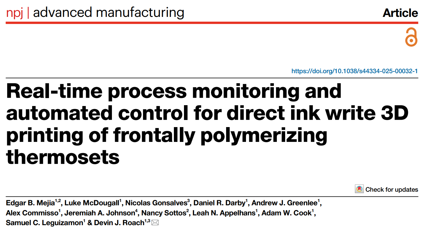 这项突破性进展最近以题为“Real-time processmonitoring and automated control for direct ink write 3D printing of frontallypolymerizing thermosets”的论文发表在《npj AdvancedManufacturing》。研究引入了一种实时过程监控和自动控制系统,可以解决这种复杂性,有望提高 DIW 打印热固性部件的保真度和功能性能。