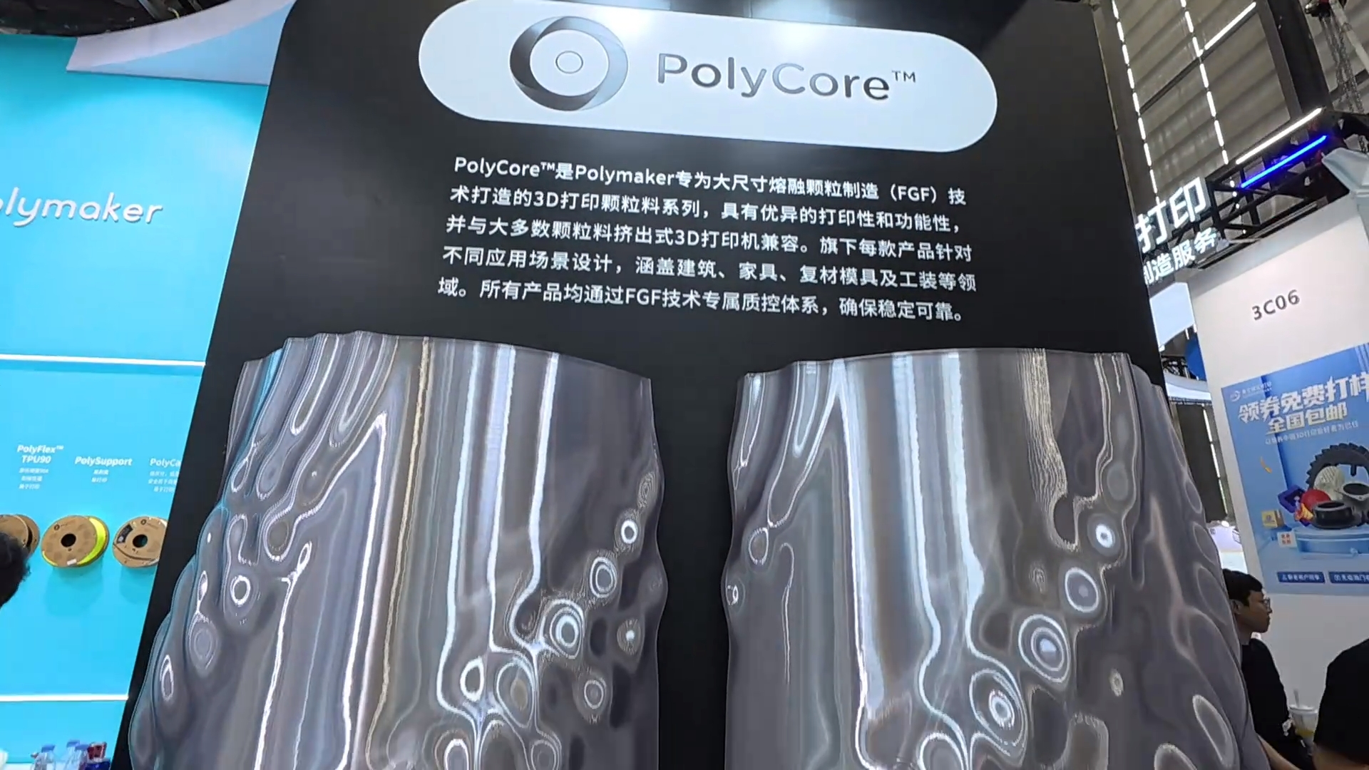 此外,Polymaker还展示了Polycore颗粒料系列,主要针对颗粒料打印机,虽打印精度略逊于线材,但可制作更大尺寸、更广泛行业应用的产品,例如用于翻砂铸造的波线增强模具。目前Polymaker已与国内外多家颗粒料打印机厂商合作,共同探索材料与设备结合的工艺。