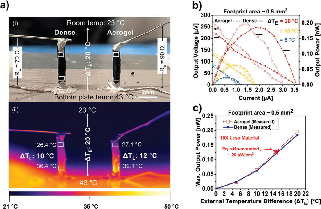 演示器件包括拱形互连结构,失效应变高达15%,并在200次应变循环中保持稳定的电阻。垂直TE柱在类似皮肤的条件下(ΔT ≈ 15 °C)产生26 nW·cm⁻²的辐射能量,在接触电阻受限的条件下,性能优于致密的PEDOT:PSS柱。