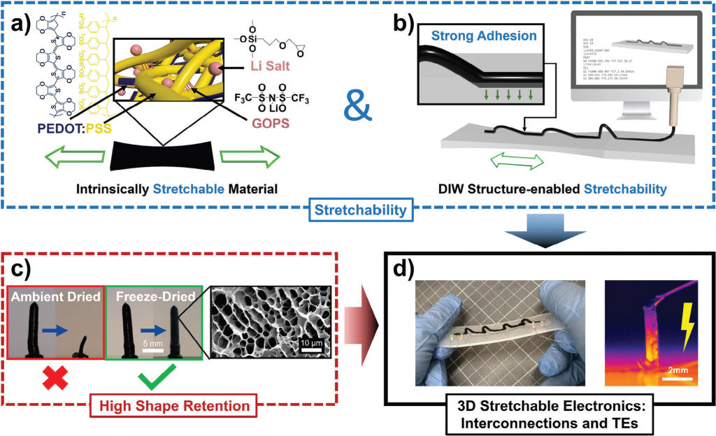 2025年9月24日,由比利时鲁汶大学Francisco Molina-Lopez教授领导的研究团队,首次展示了一种PEDOT:PSS气凝胶的全向3D打印技术,实现了可拉伸互连与高纵横比热电(TE)柱的直接制备。这一创新为可穿戴电子、软体机器人等前沿领域的柔性能源与传感器件设计带来全新可能。