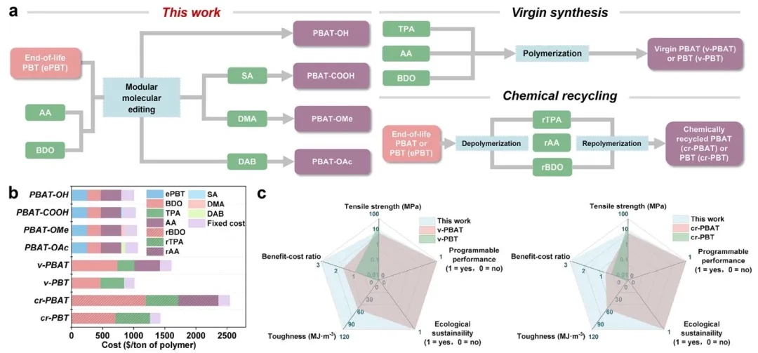 6. 废弃PBT转化为PBAT的技术经济分析图,通过对比原材料成本、固定成本及性能指标的研究方法,研究了自制PBAT与商业原生/化学回收PBAT/PBT的经济性。结果显示,自制PBAT材料成本为802.98–866.82美元/吨,较原生PBAT降低34.0%–38.1%,效益成本比达3.08–3.28(原生PBAT为2.03),拉伸强度和韧性分别超越原生PBAT 47.6%和66.2%。