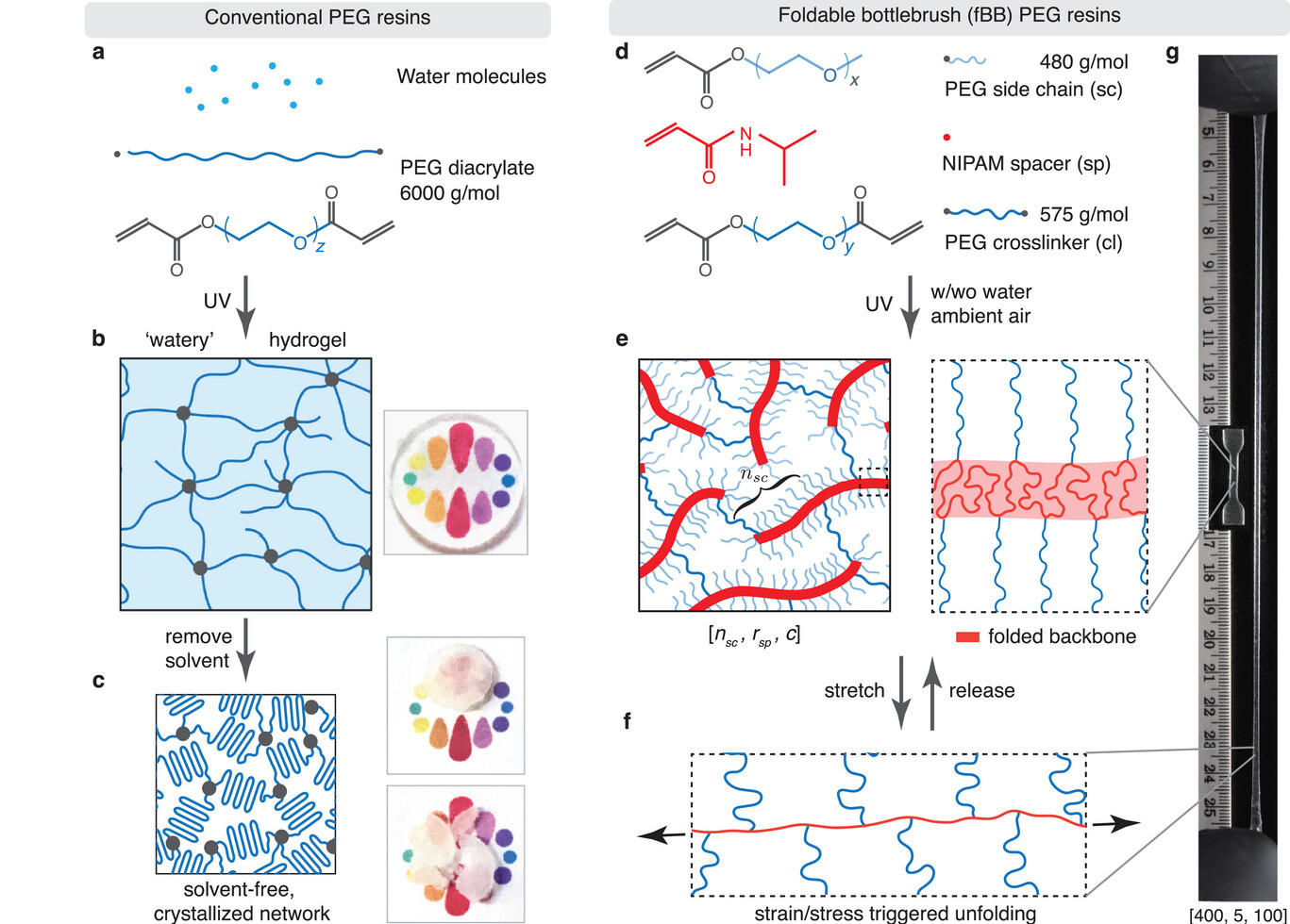 为了制备这种新型材料,Huang教授将可折叠的梳状聚合物概念应用于聚乙二醇(PEG)。他将前体混合物暴露于紫外光下几秒钟,引发聚合反应,形成梳状结构网格。最终制备出可3D打印、高延展性的PEG基水凝胶和无溶剂弹性体。Huang教授表示:“我们可以改变紫外线灯的形状,从而创造出许多复杂的结构。这些结构可以是柔软的,也可以是坚硬的,但都具有一定的弹性。这种设计上的灵活性,未来或许能够催生出制造人造器官或输送药物的新技术。”