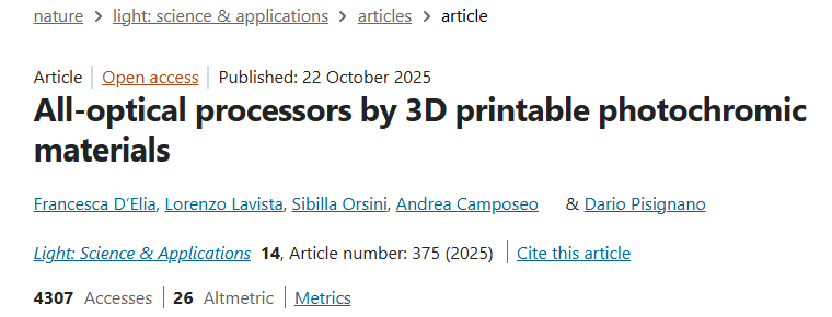 这项研究以题为“All-optical processors by 3Dprintable photochromic materials”的论文发表在《光:科学与应用》期刊上。