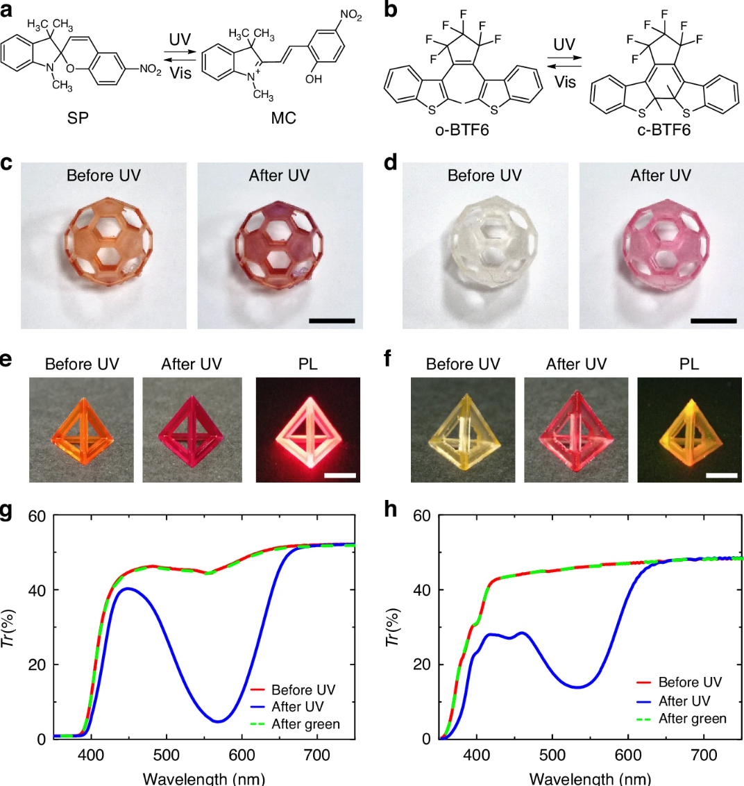 研究团队采用双酚A乙氧基化二甲基丙烯酸酯(BEDMA)制备材料。BEDMA是一种透明的紫外光固化基质,因其在可见光范围内具有良好的稳定性和透明度而被选中。二苯基(2,4,6-三甲基苯甲酰基)氧化膦(TPO)被用作光引发剂。两种光致变色分子体系被引入到基质中:一种螺吡喃化合物,1′,3′-二氢-1′,3′,3′-三甲基-6-硝基螺[2H-1-苯并吡喃-2,2′-(2H)-吲哚](SP),以及一种二芳基乙烯衍生物,1,2-双(2-甲基-1-苯并噻吩-3-基)全氟环戊烯(BTF6)。当分别暴露于紫外光(UV)和绿光下时,这两种化合物均可在无色和有色状态之间可逆切换,从而改变印刷结构的透光率。
