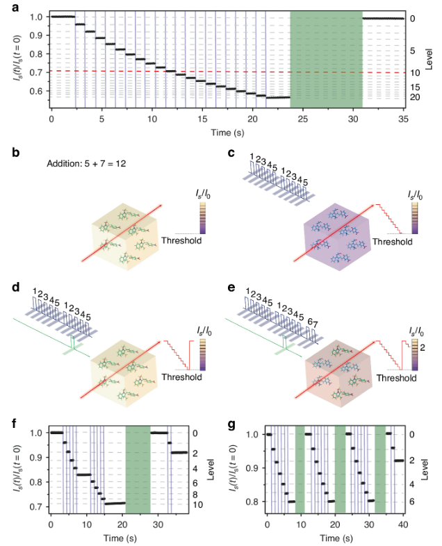 基于SP的器件被用于执行全光算术运算。每个紫外脉冲代表一个递增步骤,逐步将聚合物从透明状态转变为有色状态,从而降低透射光强度。一旦达到阈值,一个绿色脉冲就会将器件重置为初始的无色状态。利用这一过程,研究人员进行了诸如“5 + 7 = 12”之类的计算,其中紫外脉冲的数量对应于加数,而重置事件则表示进位运算。类似的脉冲序列可以实现除法运算,如“20 ÷ 6”所示,其中重置次数和剩余光强度分别代表商和余数。