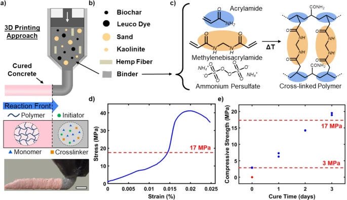 这款新型粘土基材料采用丙烯酰胺基粘合剂,通过一种名为正面聚合的化学反应,能够在从打印机挤出的瞬间进行固化。该材料不仅可以在无支撑的空隙中打印,如门窗开口的顶部边缘,而且打印后的强度可迅速达到3兆帕,能够支持多层墙体和悬挑结构(如屋顶)的建设。更重要的是,这种材料在3天内即可实现超过17兆帕的强度,这一性能可媲美传统混凝土的标准强度,而传统水泥混凝土则通常需要28天才能达到相同的强度。