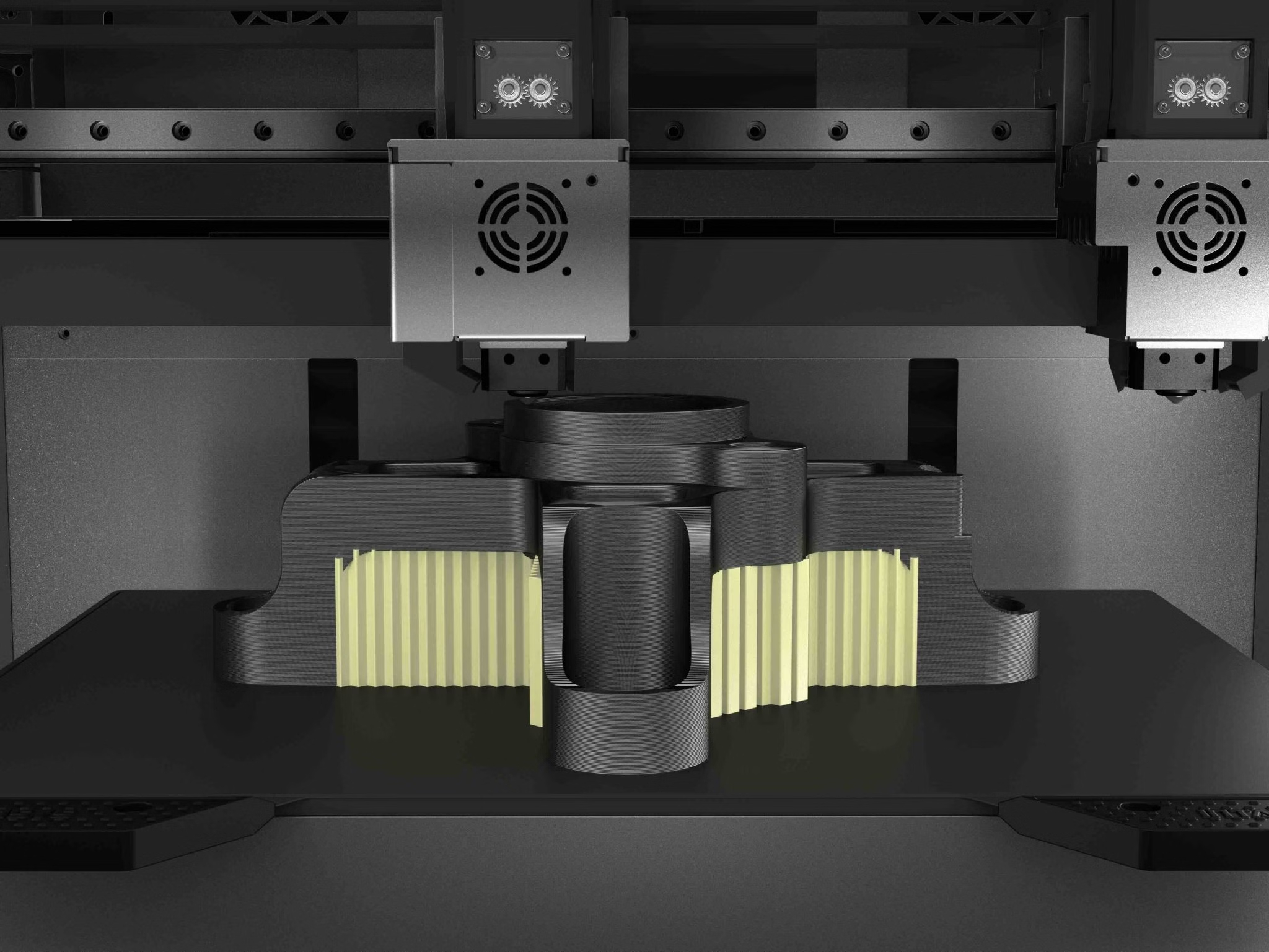 INTAMSYS的FUNMAT PRO 310 NEO配备了IDEX(独立双挤出机),支持四种不同的打印模式:镜像、复制、双材料和支撑材料打印。这一功能在打印具有复杂几何形状的部件时尤其有用,因为它允许将工程材料与水溶性或易剥离的支撑材料结合使用,从而简化了后处理工作。