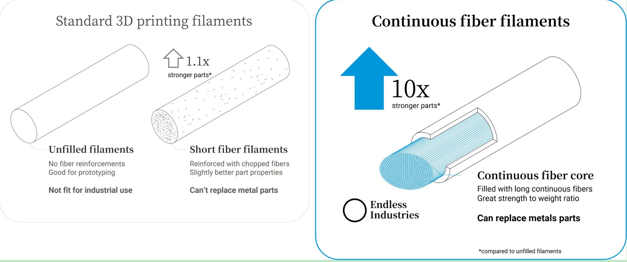 Endless Industries 是一家专注于先进3D打印技术开发和应用的高科技企业,致力于通过创新的技术解决方案推动制造业的变革与发展。Endless Industries的核心竞争力在于其自主研发的连续纤维3D打印技术。这一技术能够利用连续的碳纤维或其他高性能纤维材料进行打印,从而生产出具备卓越机械性能的产品。相较于传统的3D打印方法,连续纤维3D打印技术可以制造出更轻、更强的零部件,特别适合于航空、汽车、医疗等高要求领域的应用。