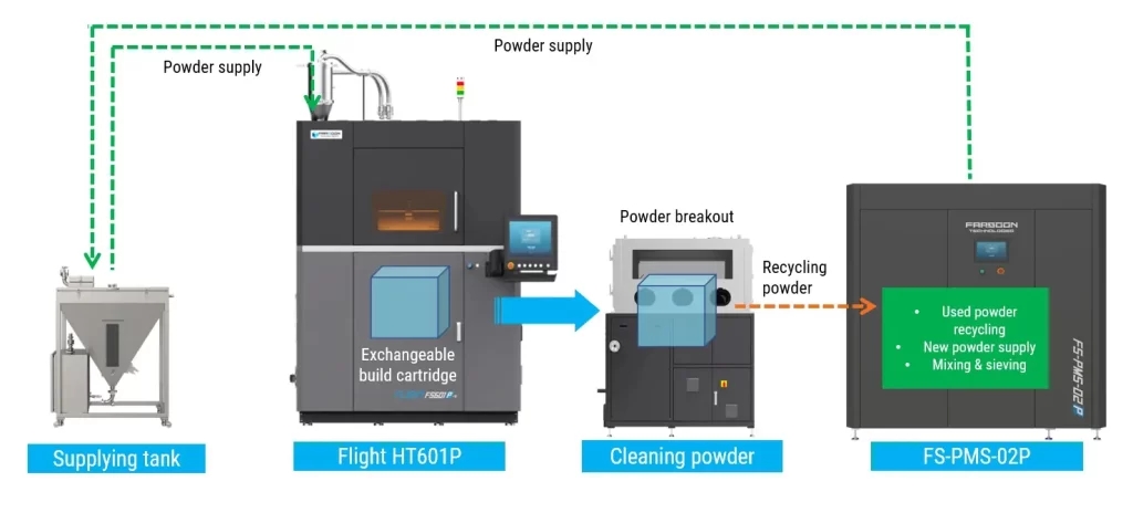 在这一市场背景下,Flight HT601P-4金属3D打印机的推出显得尤为及时。该机型专为与大规模生产环境无缝集成而设计,简化了工作流程,并提供了先进的粉末管理系统,支持粉末回收、混合和筛分功能。它的智能生产线集成将粉末处理、构建圆筒传输、零件冷却和分离系统集成为一个高效的自动化制造流程,这与市场向更经济实惠和基础功能方向发展的趋势相吻合。