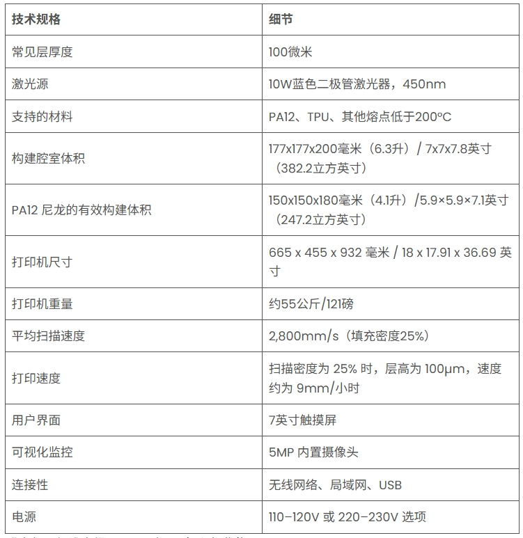 Inova MK1搭载10W蓝色二极管激光器,工作波长为450纳米,通过高精度振镜聚焦,光斑尺寸约350微米。它的垂直运动采用Nema17步进电机配合滚珠丝杠,实现高效稳定的层高控制。设备拥有177 x 177 x 200毫米(6.3升)的打印腔体,有效成型体积为150 x 150 x 180毫米(4.1升),主要支持PA12尼龙材料的打印需求。