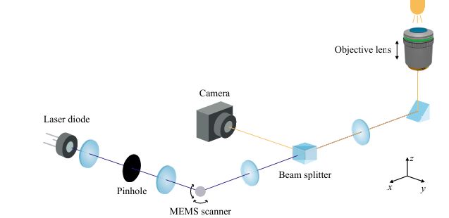 ●扫描与管镜:MEMS扫描器和管镜组合使用,将MEMS镜像在物镜的入瞳平面上,并扩大光束直径。