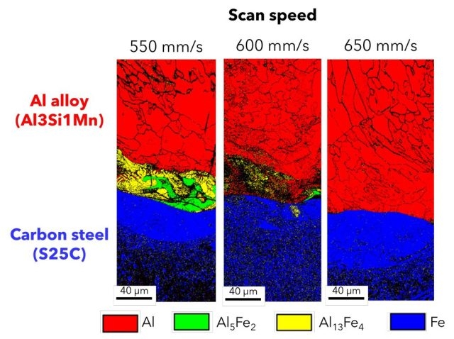 这项研究的目的是生产一种重量轻但不影响强度的钢铝合金。为此,研究团队采用了激光粉末床熔合(LPBF)技术,并发现通过提高激光扫描速度,可以显著减少脆性金属间化合物(例如Al5Fe2和Al13Fe4)的形成。研究者提出,高速扫描引发的非平衡凝固过程有助于最小化溶质分配,从而降低材料弱点的产生。结果,最终产品展现出优异的结合界面强度。