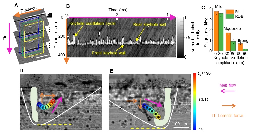然而,施加磁场会同时激活电磁阻尼(EMD)和热电洛伦兹力,后者驱动的流动称为热电磁流体(TEMHD)。这项研究解决了一个长期存在的争议,即哪种机制(EMD或TEMHD)负责稳定匙孔,由于增材制造过程的微小熔池尺度,研究证明TEMHD效应起了主导作用。为了观察这一过程,研究人员使用了APS的32-ID光束线,这是唯一能够提供足够通量以满足所需成像速率的X射线源。为了捕捉发生在1毫秒内的匙孔振荡,必须以每秒超过10万帧的速度获取图像。团队在光束线上改装了一台定制的3D打印机,设置了一个可以在激光下快速移动的样品床,并填充了AlSi10Mg粉末,这是一种由铝、硅和镁组成的轻质合金,其中高硅含量为系统增加了类似半导体的特性。研究人员开发了一系列的图像处理方法,提出了基于图像处理的定量化匙孔震荡的新方法。