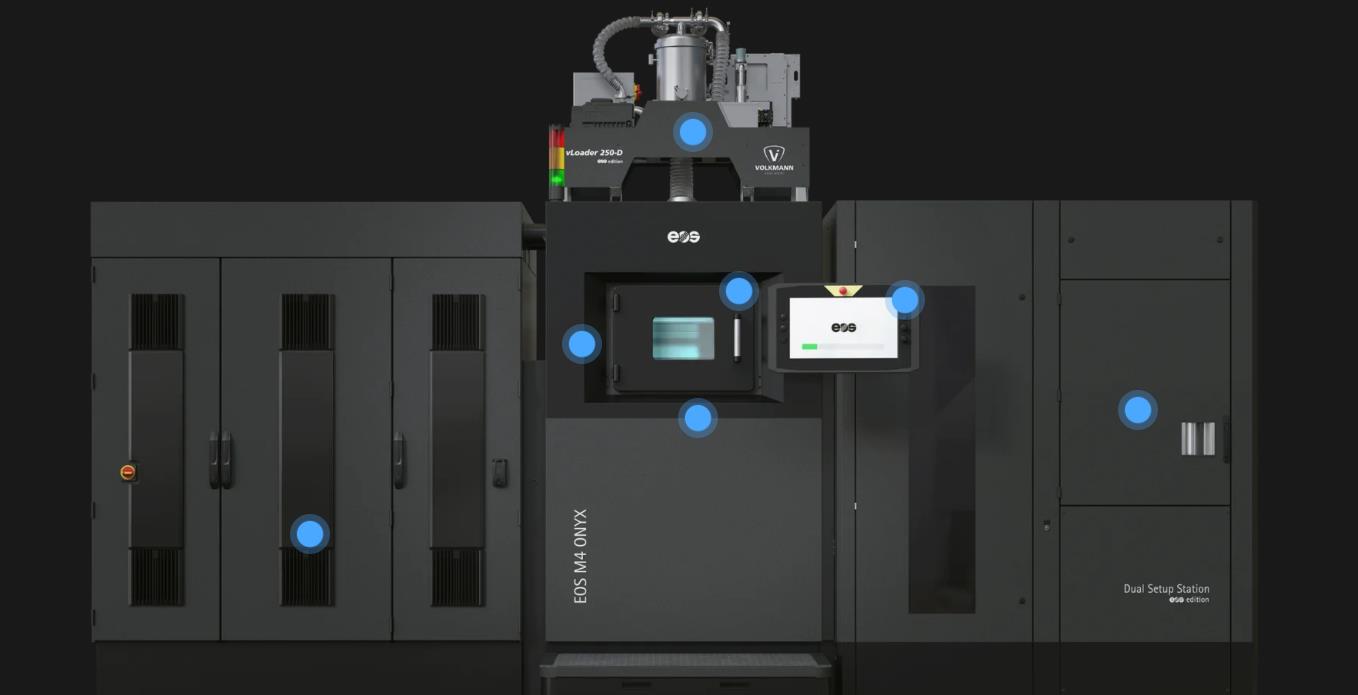 EOS将M4 ONYX定位为一款可扩展的生产系统,并由Volkmann和Grenzebach的合作伙伴技术支持。该公司的RFS Pro过滤模块可实现粉末的完全再利用,同时中和有害冷凝物并消除耗材,这一组合可将有害废物减少高达90%。Volkmann自动化粉末处理系统(EOS版)进一步实现了粉末管理的自动化,系统提供了一个闭环、可扩展的输送和筛分工作流程,专为连续运行而设计。对于高通量生产环境,Grenzebach双工位设置站(EOS版)可在30分钟内完成作业自动切换,使制造商能够实现无人值守的全天候生产。