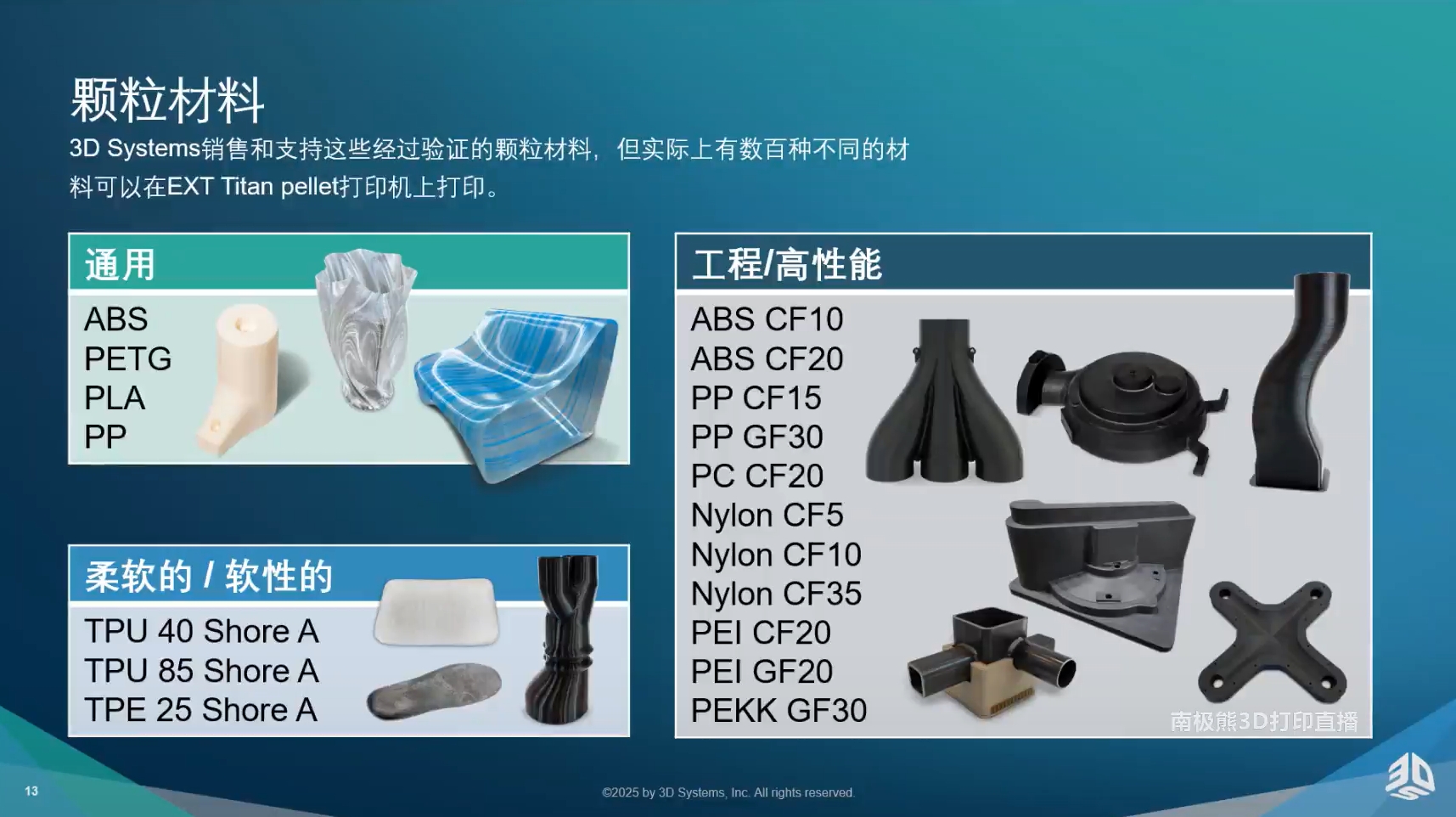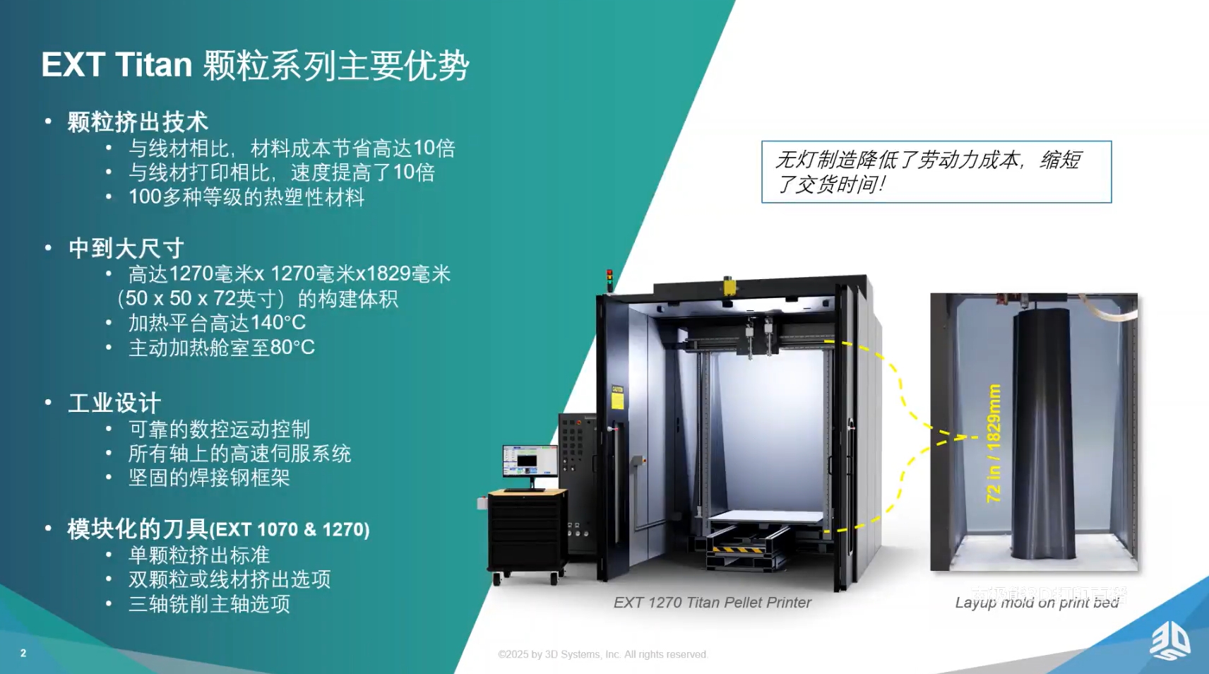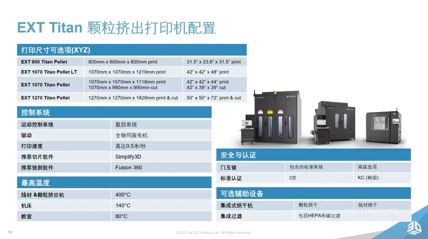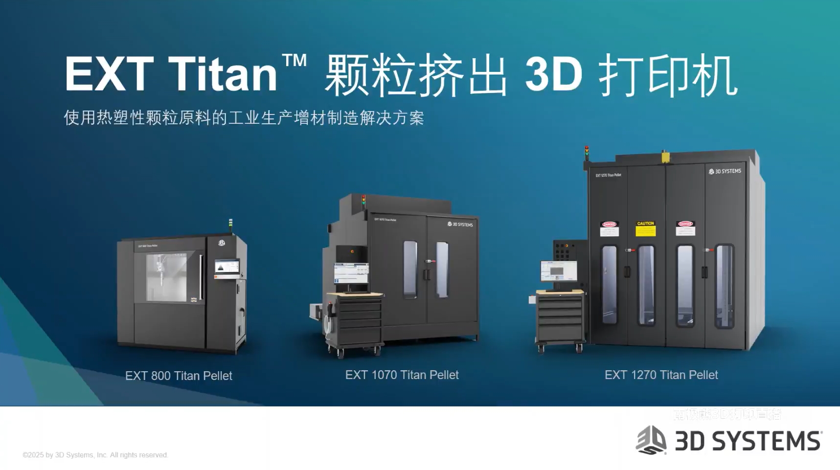 2025年6月12日,3D Systems 举办了一场线上研讨会,重点介绍其新推出的 Titan 颗粒料挤出 3D 打印机,凭借前沿技术和创新设计,Titan 吸引了来自全球制造业、科研机构等领域众多专业人士的关注。Titan系列目前包含三款产品:EXT 800 Titan Pellet、EXT 1070 Titan Pellet 和 EXT 1270 Titan Pellet。