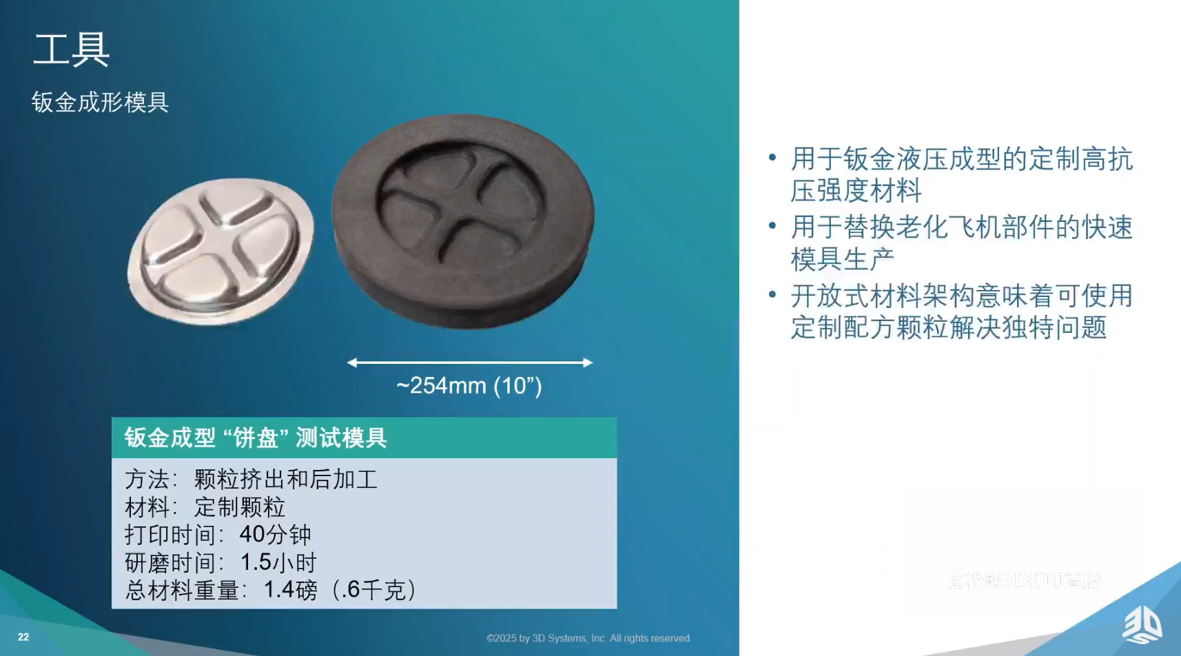 此外,Titan 还可以用于打印钣金成形模具,采用定制的颗粒材料,打印时间40分钟,材料重量0.9公斤。
