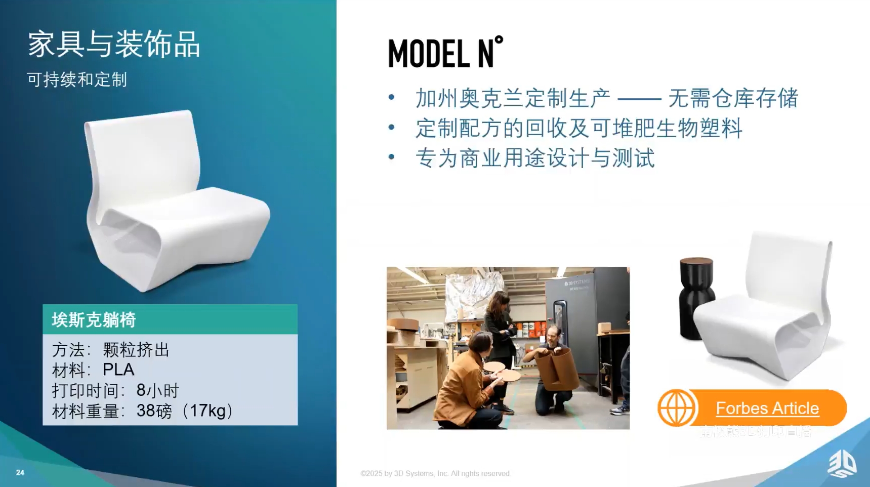 在家具与装饰品制造方面,Titan 正帮助加州奥克兰进行无需仓库存储的定制生产,打印一个埃斯克躺椅,一般需要8个小时,使用材料17公斤。