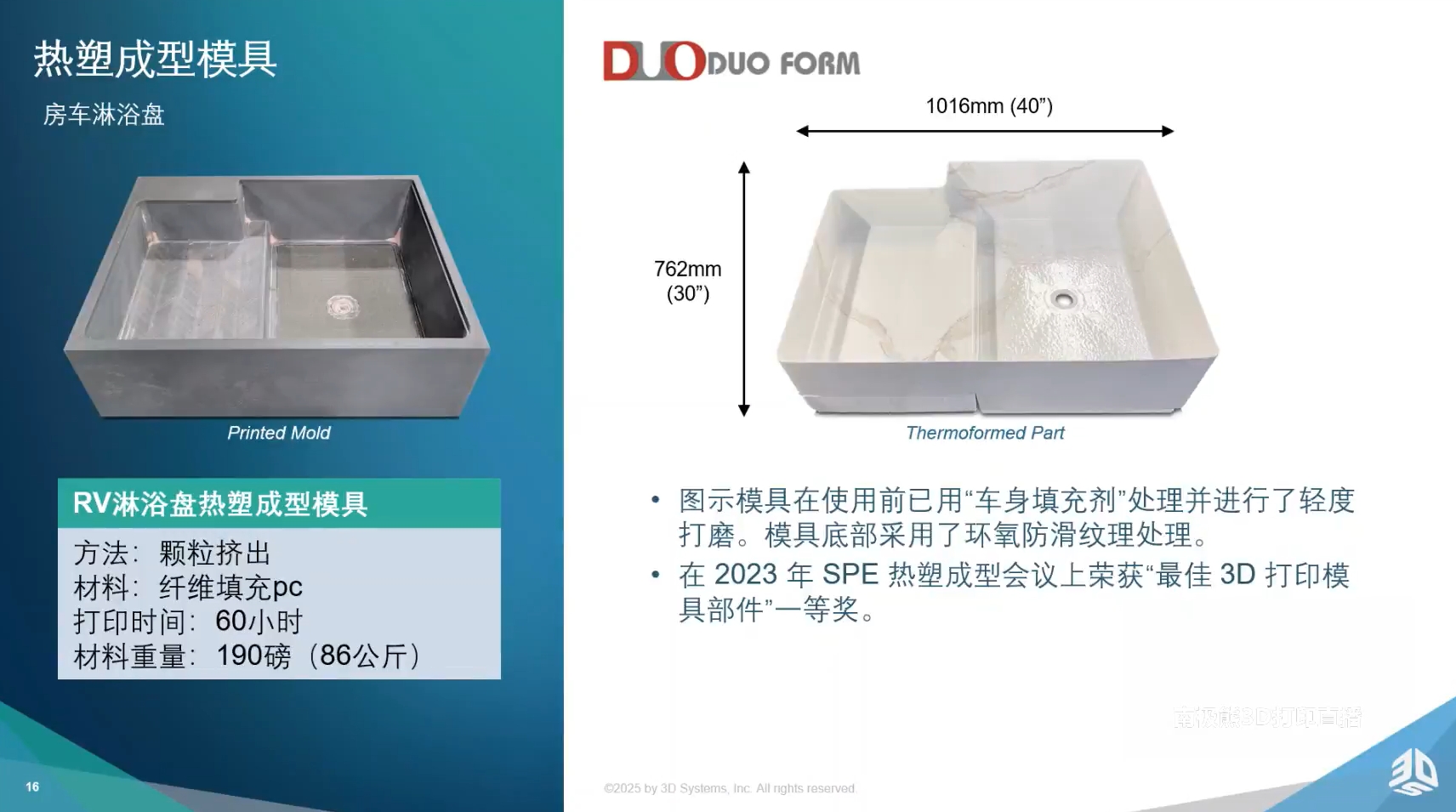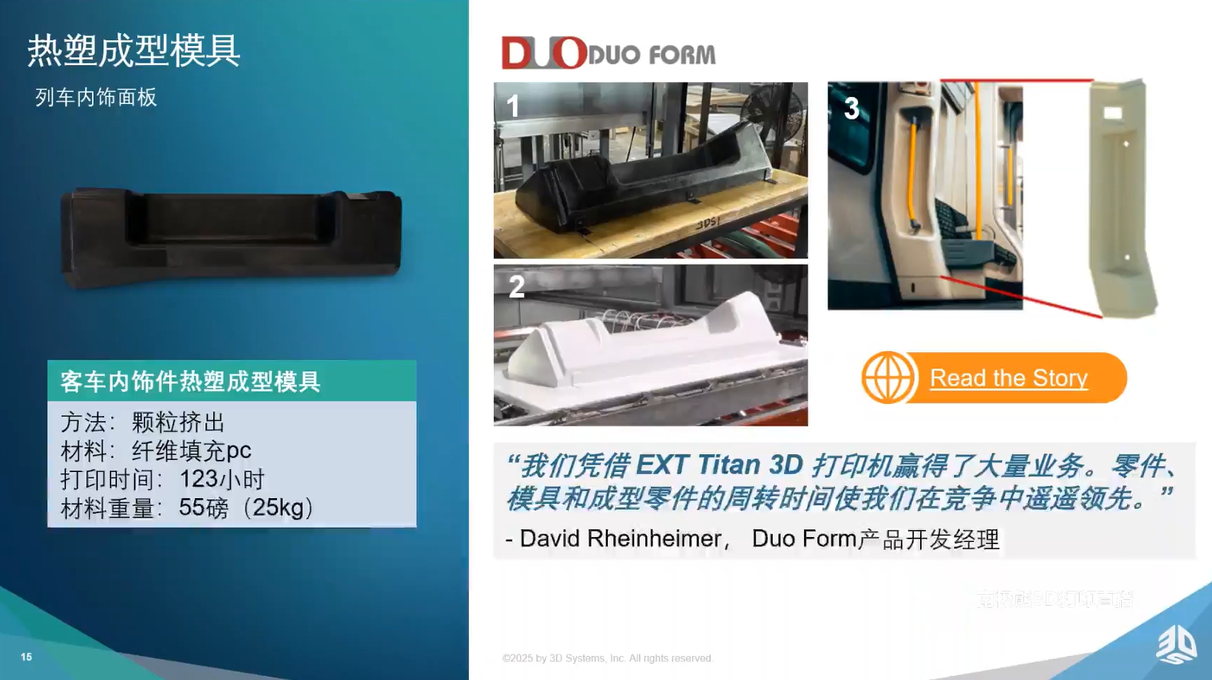 在研讨会中,3D Systems分享了几个代表性的应用案例,比如使用Titan 3D打印的客车内饰件热塑成型模具,使用纤维填充PC材料,打印时间123小时,材料重量25公斤 。