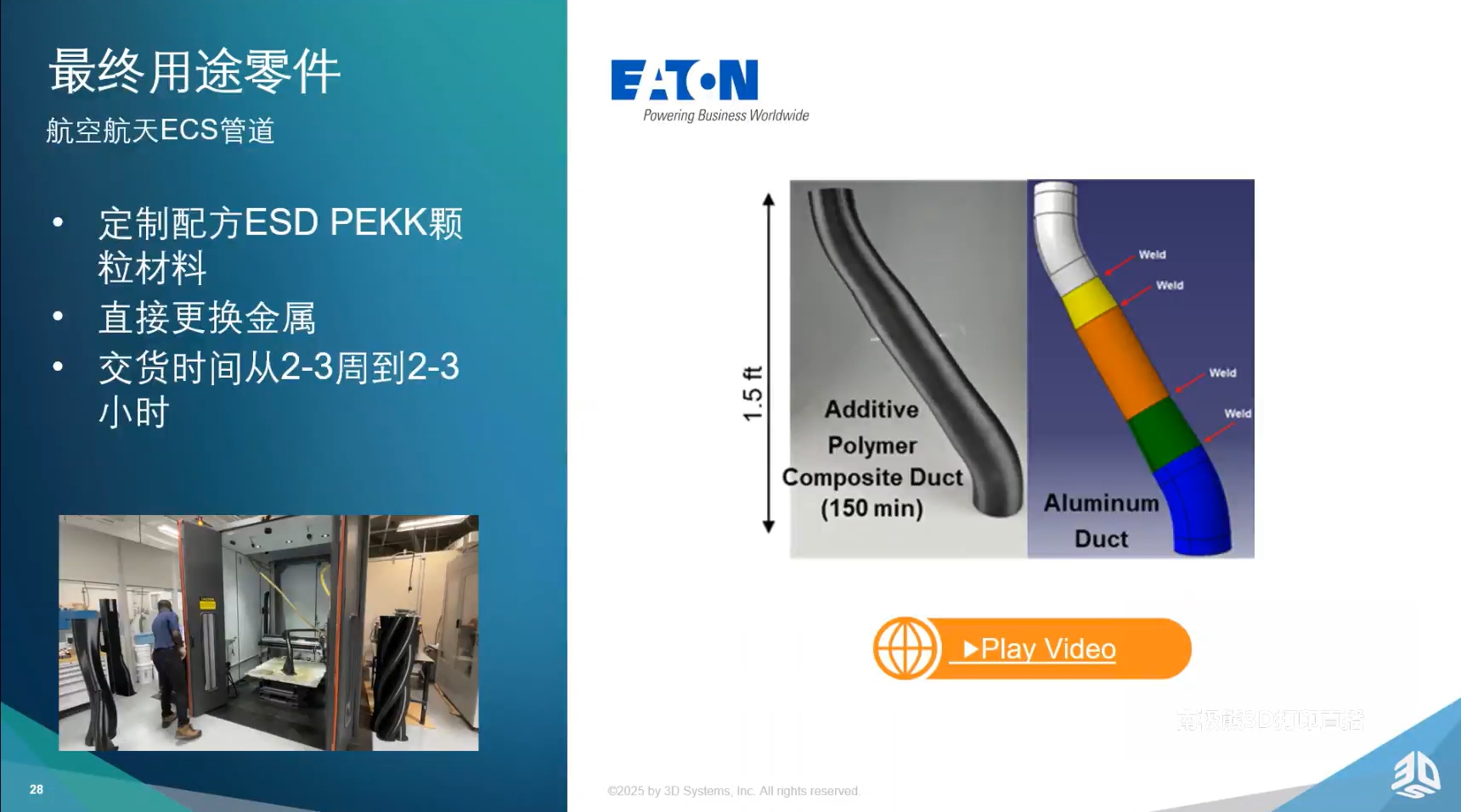 在最终用途零件方面,Titan 为航空航天领域的用户制造管道等产品,采用定制的ESD PEKK颗粒材料,其高强度性能可以直接替换金属件,将零件的交货周期从2-3周缩短到2-3小时。