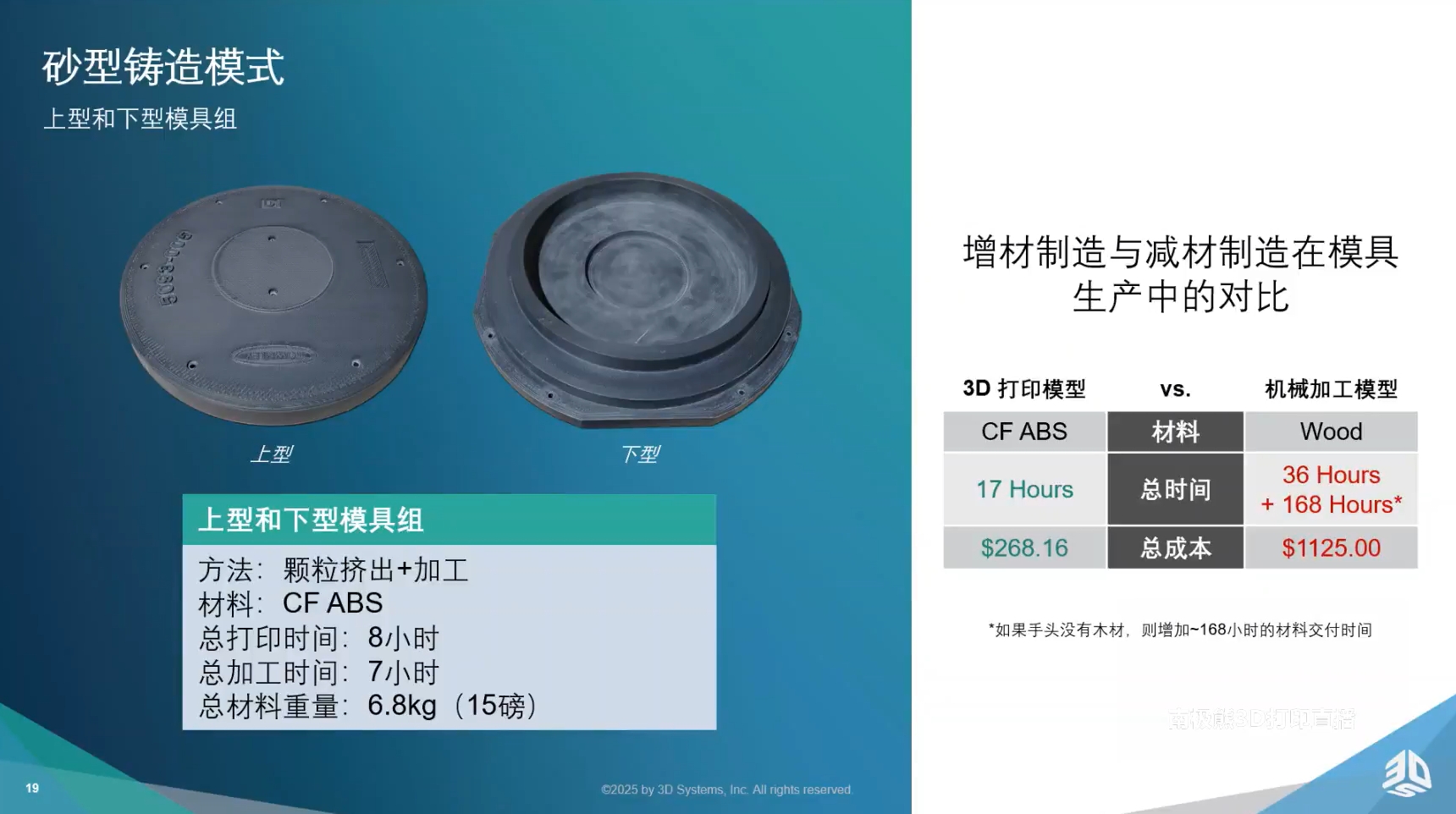 在砂型铸造领域,使用Titan 3D打印机制造的上型和下型模具组,采用CF ABS材料,打印时间为8小时 ,材料重量为6.8公斤。