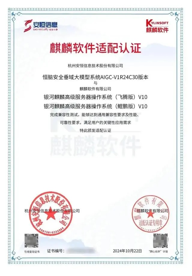近日,恒脑·安全垂域大模型系统完成了与麒麟软件的适配认证,覆盖了包括飞腾版V10、鲲鹏版V10以及兼容版V10在内的多个版本的银河麒麟高级服务器操作系统。这一成就不仅展示了恒脑在操作系统兼容性上的广泛适应性,也进一步证明了其产品在国产化道路上的坚定步伐。