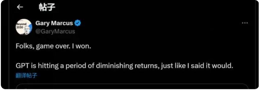 AI模型开发遇阻的消息公开后,知名AI评论家加里·马库斯(Gary Marcus)甚至直接单方面宣布“胜利”:“游戏结束,我赢了!我早就说过,GPT正在陷入收益递减阶段。”一直以来,马库斯就预测,生成式AI的发展将进入停滞阶段。