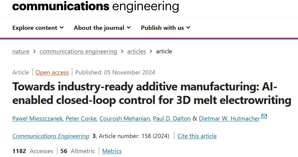 2024年11月21日,来自昆士兰科技大学 (QUT) 的生物医学工程师开发出一种新的自动化方法,可大幅推进熔融电写技术(MEW)的发展。熔融电写技术是一种用于组织工程和再生医学的新型高分辨率 3D 打印技术。相关研究成果以题为《Towards industry-ready additivemanufacturing: AI-enabled closed-loop control for 3D melt electrowriting/迈向工业化的增材制造:基于人工智能的 3D 熔融电书写闭环控制》的论文发表在《通信工程》杂志上。论文第一作者 PawelMieszczanek 博士在昆士兰科技大学 ARC 增材生物制造培训中心获得博士学位,他表示,研究人员的方法将加快熔融电写 (MEW) 技术的发展。