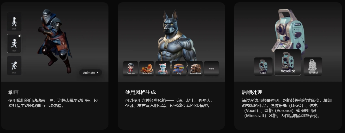 除了模型生成和优化,Tripo 的 API 还支持自动动画制作,能让静态设计动起来。这样做的目的是让演示和用户体验更加生动,同时开发者所需付出的精力也最小化。定制和格式转换功能也具备。用户可以对模型进行创意风格化处理,比如将其转换为类似乐高积木或基于体素的版本,以满足各种项目需求。此外, API 支持转换为 USDZ 和 FBX 等广泛使用的格式,确保在不同平台和应用程序之间的兼容性。