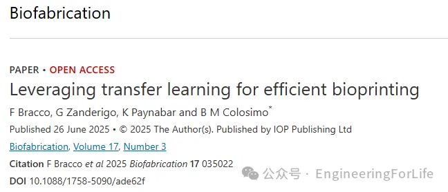 有鉴于此,来自意大利米兰理工大学的B M Colosimo团队通过原位生物打印监测技术,开发了一套基于迁移学习(TL)的资源高效型生物打印建模方法,旨在实现既有知识体系与新实验条件的有机融合。迁移学习作为一种跨相似领域知识迁移的机器学习策略,被应用于挤出式生物打印的可打印性响应建模案例中。相关研究成果以“Leveraging transfer learning for efficient bioprinting”为题于近期发表在《Biofabrication》上。
