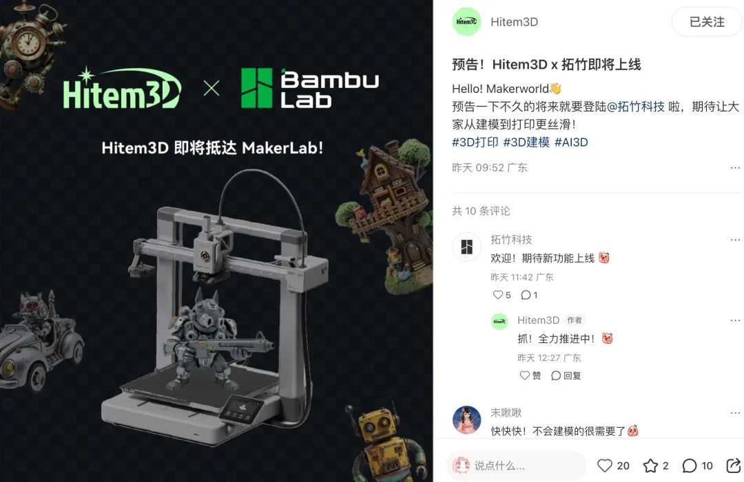 背后的逻辑很清晰:AI 造物的市场正在从实验性走向生产性,Hitem3D 打通的正是从创意到产线的高速通道。无论是个人爱好者的手办打印,还是中小企业的产品打样,亦或是游戏影视产业的资产生产,Hitem3D 都在逐渐成为一个高效的底层工具。而与拓竹的合作,正好把这种能力带到了最具活力的 3D 打印社区。