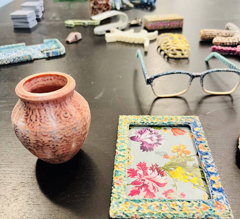实验室里摆着日常用品:药盒、手机支架、餐具架。乍看普通,细看却藏着玄机。这些物品都用AI工具定制过。比如一个餐具手柄,原本单调的金属表面被添上花朵图案,但依然好用。手机支架能加有机纹路或彩色装饰,却依然稳稳夹住手机。