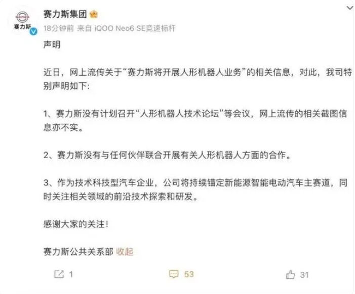 将开展人形机器人业务?赛力斯紧急回应