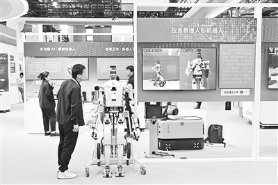 2024中关村论坛年会期间,中关村展示中心常设展在北京重装亮相。展览集中展示了人工智能、量子信息等前沿科技领域430多项技术、产品。图为中关村展示中心常设展上展示的一款应急救援人形机器人(4月26日摄)。新华社记者 李鑫摄