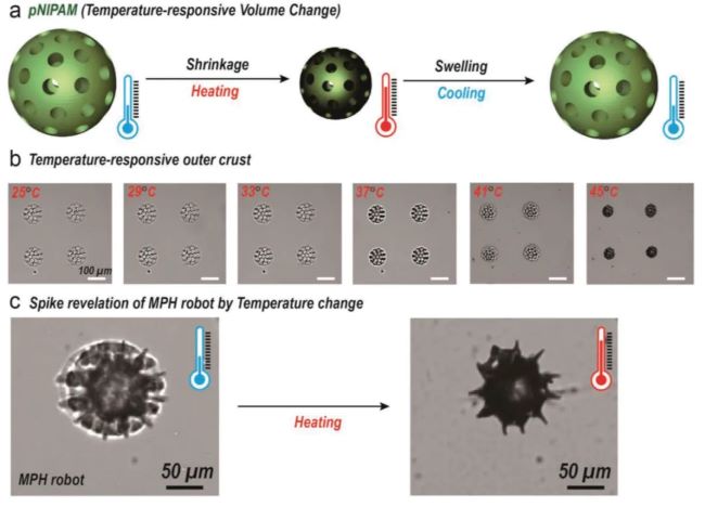 在研究过程中,研究团队采用了双光子聚合的3D微打印技术,利用Nanoscribe设备Photonic Professional GT制造出这些微型机器人。通过这种先进的打印技术,研究者们能够精确控制微型机器人的结构和功能,使其能够在生物环境中独立执行多种任务。具体而言,MPH机器人在温度升高时,外壳的pNIPAM材料会收缩,暴露出内部的刺状结构,从而实现对生物组织的可控附着。这种设计不仅提高了微型机器人的附着能力,还使其能够在生物体内灵活移动。