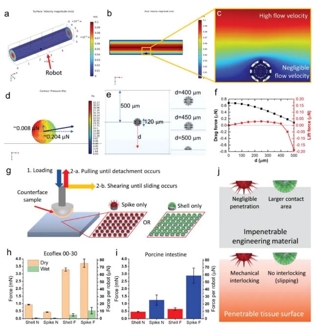 在实验中,研究者们对MPH机器人的附着性能进行了评估,发现其在生物流体环境中能够有效抵抗外部干扰,保持稳定的附着力。通过COMSOL模拟,研究团队估算了微型机器人在生物通道内的升力和阻力,结果表明,MPH机器人在生物通道内的运动速度远低于通道中心的流速,这使得其在附着时能够有效抵抗流体的干扰。此外,研究还表明,MPH机器人的刺状结构在与生物组织接触时,能够提供显著的附着力和摩擦力,尤其是在软生物组织表面,表现出优异的附着性能。