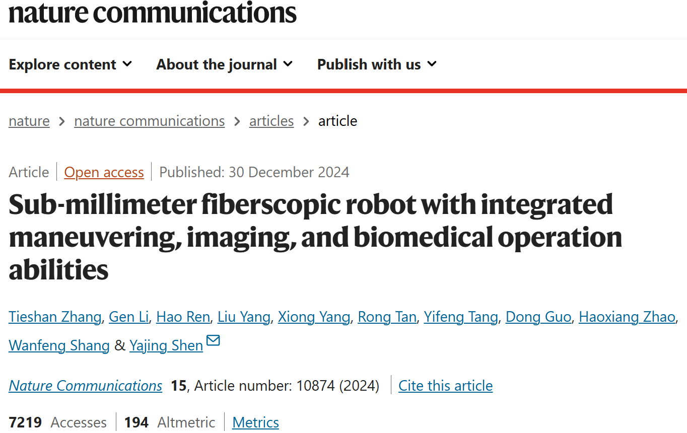 相关研究成果以题为“Sub-millimeter fiberscopicrobot with integrated maneuvering, imaging, and biomedical operation abilities”的论文发表在《自然通讯》期刊上。