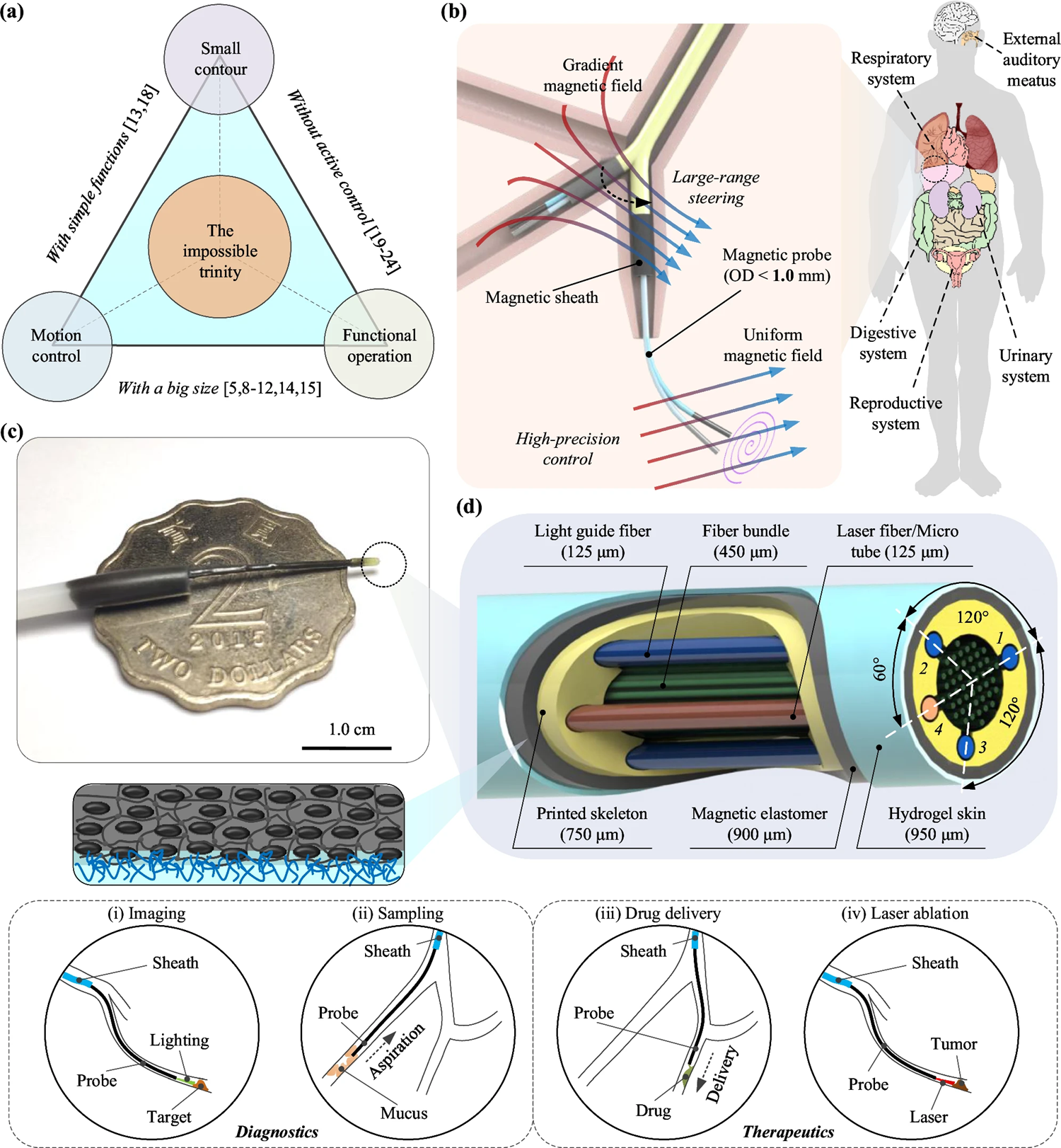 △具有成像、机动和医疗操作能力的基于光纤的亚毫米连续机器人概览。