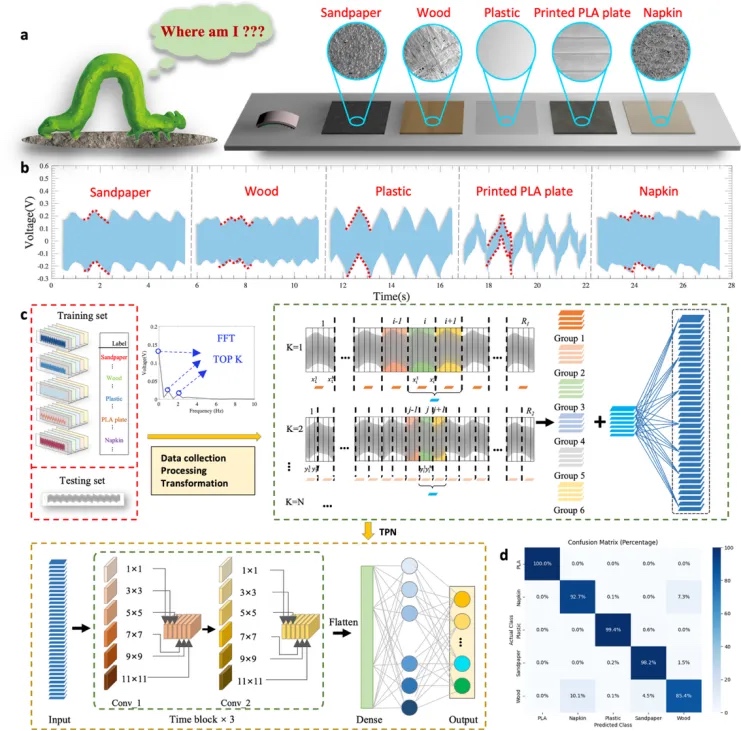 研究构建了基于机器学习的智能感知系统,创新性地将微锥矩阵的接触力学特性转化为高灵敏度电信号,开发具有多尺度特征提取能力的时序感知网络(TPN),建立动态窗口采样机制实现实时地形分类。在5类典型地形测试中,系统识别准确率达96.7%,响应延迟<50ms,且经过12000次循环测试后性能衰减<5%,满足了移动机器人对感知系统实时性、稳定性要求(图3)。