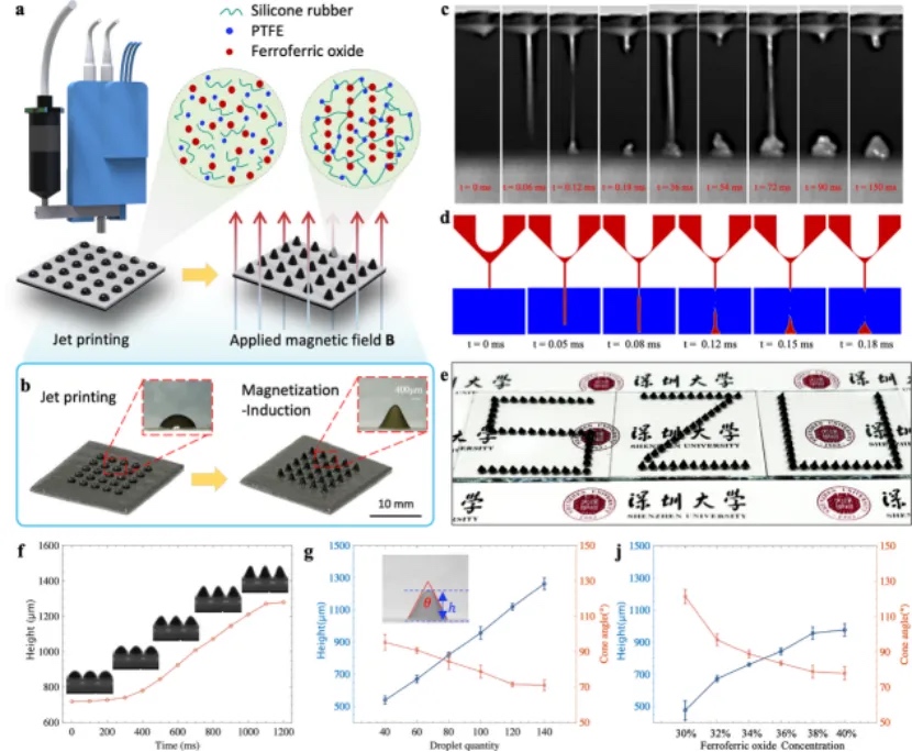 研究突破了软体机器人精密制造的瓶颈,开发的协同喷射打印与磁感应(CJM)技术融合了高精度喷射打印与动态磁场成型两大核心工艺,将传统需要数小时的模板法制造过程缩短至数分钟之内,且无需复杂模具,制造成本降低80%,实现了微锥结构的高度可控生长,为多功能软体机器人的快速原型开发提供了标准化制造平台(图2)。