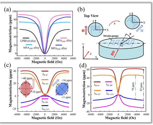 总之,本研究证实了LPBF和MFA工艺在协同提高磁致伸缩应变和灵敏度方面的巨大潜力,为高性能磁致伸缩合金的开发提供了新的思路。