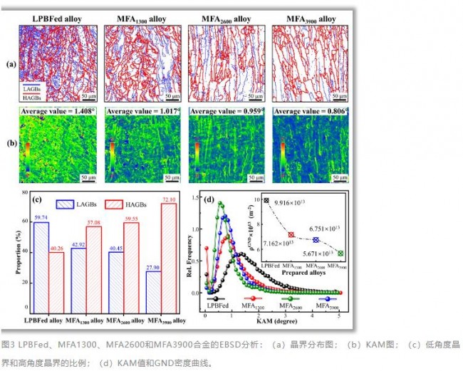 通过电子背散射衍射(EBSD)技术研究了Fe81Ga19合金的晶粒形貌、晶粒尺寸和晶粒取向的变化(图1),在合金中观察到以柱状晶为主的晶粒组织(图1a),且合金的晶粒尺寸分布相似(图1b)。另外,合金的织构类型近似为{100}<001>立方织构(图1c),具有沿构建(BD)方向的<001>择优取向。采用显微磁力显微镜(MFM)对合金的磁畴进行了观察(图2),发现LPBF制备(LPBFed)合金中存在具有较强钉扎效应的迷宫畴。MFA处理后,磁畴逐渐转变为排列整齐的90°畴,其平滑的结构更有利于磁畴运动。进一步分析了合金的晶界(图3a)和位错(图3b)演变,发现在MFA的磁化驱动力作用下,MFAed合金中高角度晶界比例显著增加(图3c),并伴随着位错密度的降低(图3b和3d),这有效削弱了磁畴运动阻力,从而提高了合金的磁致伸缩灵敏度。