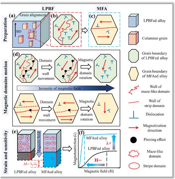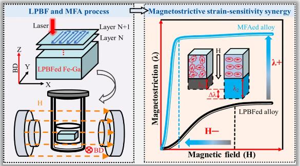 图7 LPBFed和MFAed合金的微结构演变和磁致伸缩应变-灵敏度协同示意图。