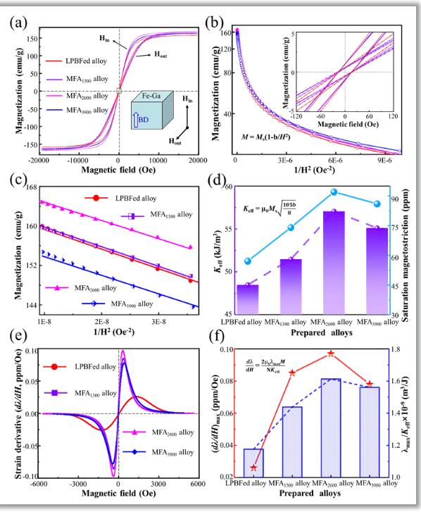通过磁滞回线测量研究了Fe81Ga19合金的磁性能(图6a),发现合金具有较强的磁各向异性,并表现出典型的软磁性能。另外,利用趋近饱和法对Fe81Ga19合金的有效磁各向异性(Keff)进行了计算(图6b-c),发现Keff呈现出与饱和磁致伸缩应变一致的变化趋势。MFAed合金的Keff是磁晶各向异性和磁场感生磁各向异性共同作用的结果,这有效增强了合金的磁致伸缩应变。最后,计算了Fe81Ga19合金的最大应变灵敏度(|dλ/dH|max)(图6e和6f),发现MFA1300合金(0.085 ppm/Oe)和MFA2600合金(0.097 ppm/Oe)的应变灵敏度相比于LPBFed合金(0.026 ppm/Oe)分别提高了226%和273%。